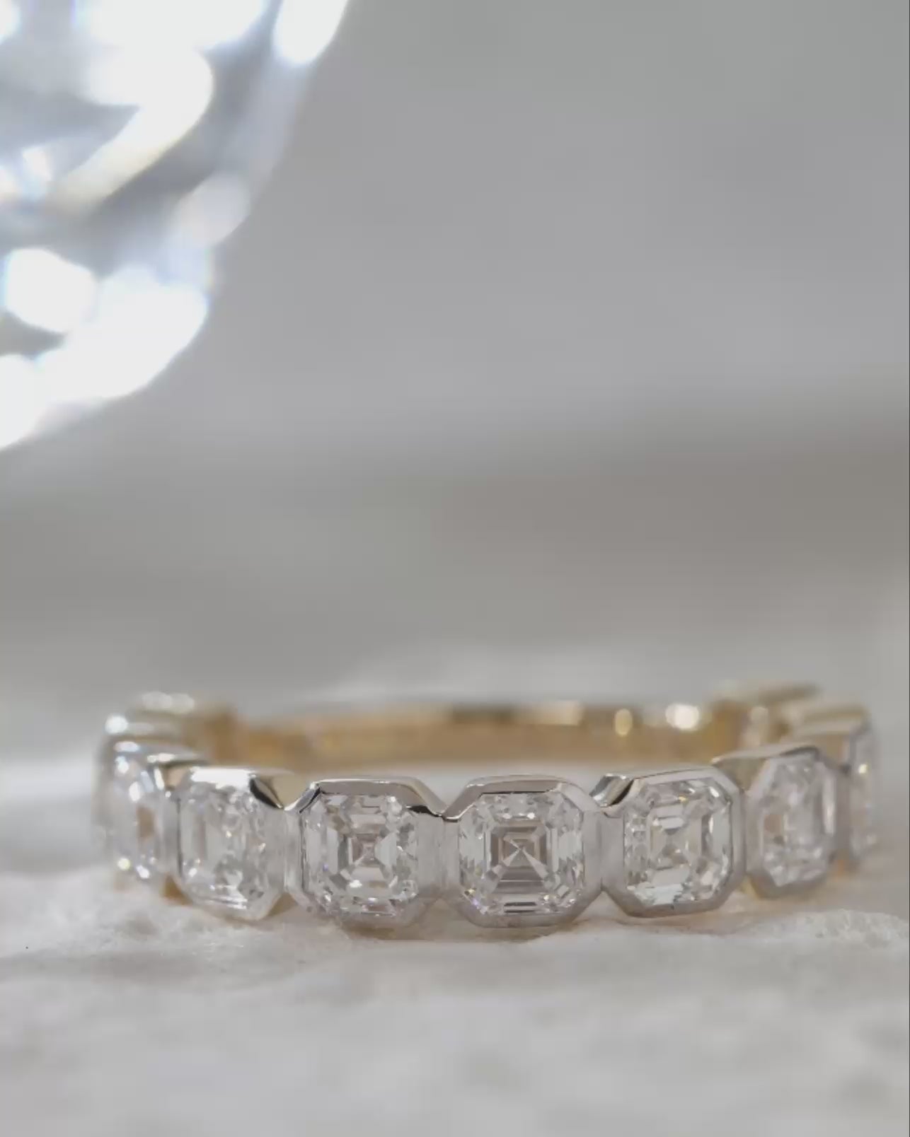 3/4 Eternity asscher lab made diamond band in 14k yellow and white gold